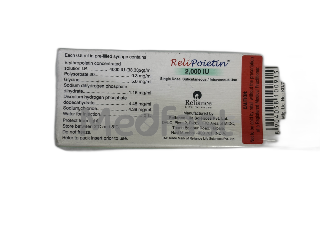Relipoietin 2000 IU Injection works by stimulating the bone marrow to increase the production of red blood cells (RBCs). Red blood cells are responsible for carrying oxygen throughout the body, and by boosting their levels, this medication helps to alleviate anemia and improve oxygen delivery to tissues and organs