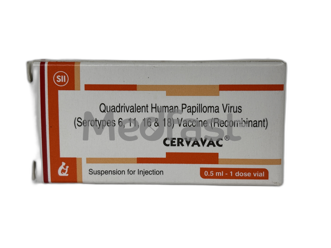 Cervavac Injection consists of the active constituent Human Papilloma Virus vaccine. It is indicated to protect your body against infections and diseases caused by the human papillomavirus types 6, 11, 16, and 18. These virus types cause diseases like pre-cancerous lesions in the female genital areas (cervix, vulva, vagina) and anal regions and cause genital warts in males and females.